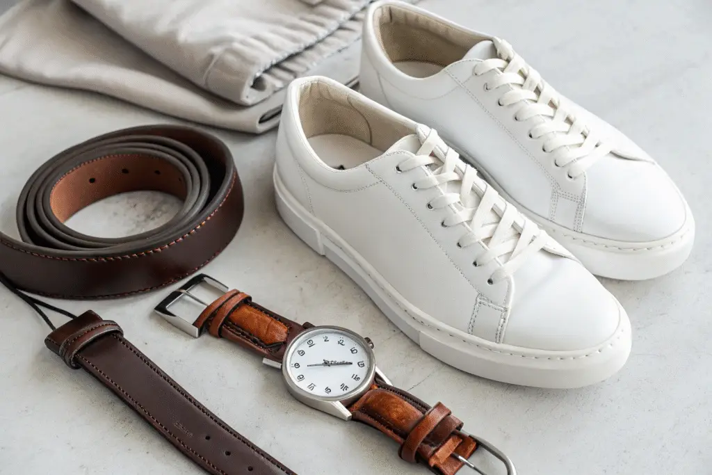A pair of minimalist white leather sneakers is the most versatile footwear choice. They are clean, classic, and work with every casual item mentioned in this guide. For accessories, a classic watch with a leather or metal strap adds a touch of sophistication. A sturdy, yet stylish belt that matches your footwear is also a fundamental rule of thumb for a pulled-together appearance.