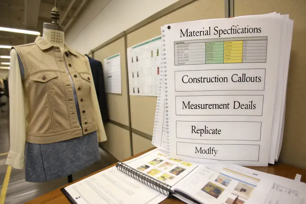 Construction methods, precise measurements, material specifications, tolerance requirements, and compliance information must be documented separately from your reference garment. These elements form the manufacturing blueprint that ensures consistent, reproducible results.