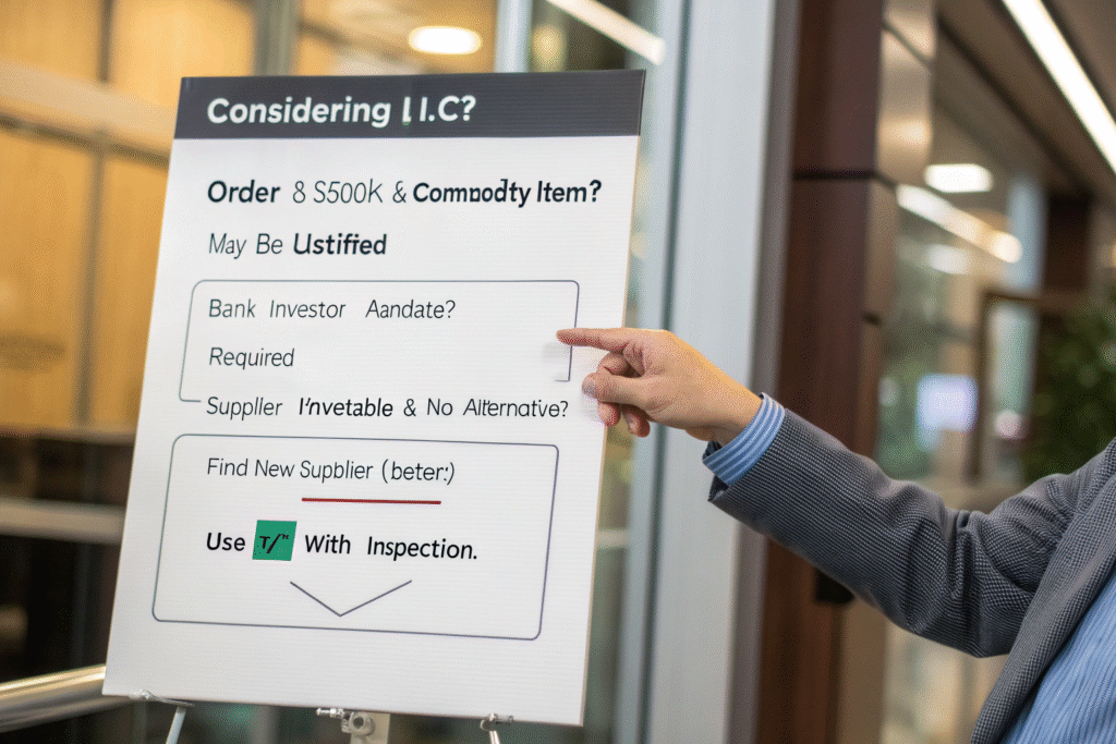 If you are ordering $500,000+ of a standard, commoditized item (e.g., basic socks, generic t-shirts) from a new supplier, the absolute financial exposure might justify the L/C cost as an insurance premium.