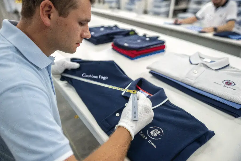 First, we conduct a pre-production sample approval. Before any bulk production, we create a physical sample with your exact logo on the actual garment. You sign off on this. Second, we perform in-line checks during production. Operators check the first article and then random pieces throughout the run for placement, color matching, and defects. Finally, a final random inspection (FRI) is done on the packed goods. Last year, a client from Chicago ordered 150 branded polo shirts for their sales team. Our QC team caught a slight misalignment in the logo placement on the first sample. We corrected the screen and sent a new sample for approval within 48 hours, preventing a bulk error.