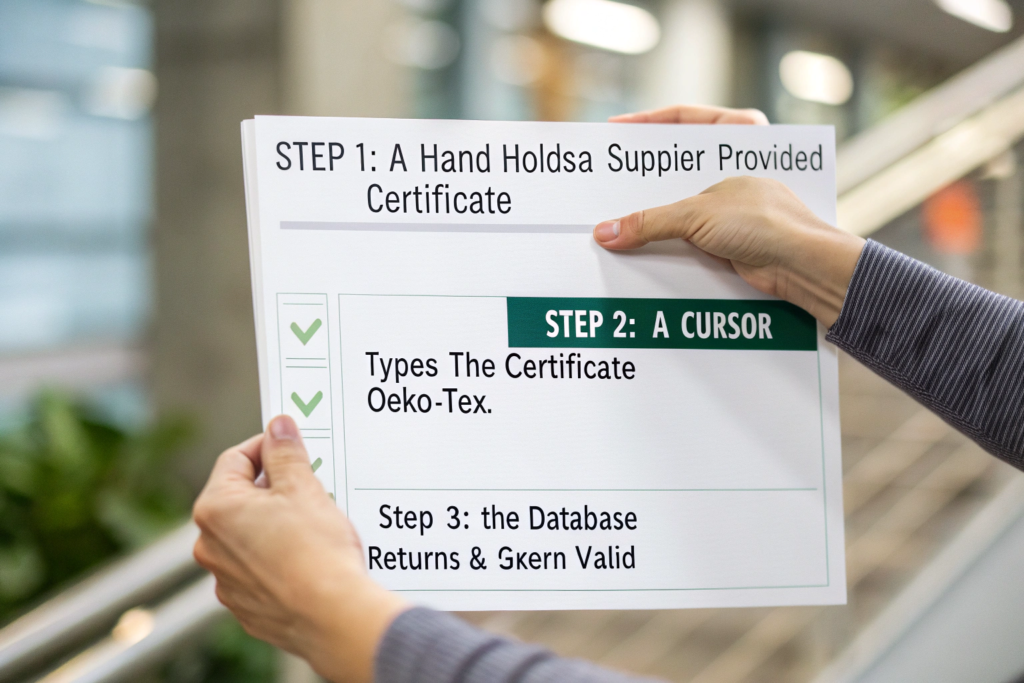 The official verification process has two main steps. First, you need the correct details from the supplier: the certificate number, the holder’s name (which should exactly match the supplier company), and the valid-to date. Second, you input these details into the free, public OEKO-TEX Certification Check database. A genuine, active certificate will return a match showing the product scope, applicant, and issuing institute. No match means the certificate is invalid.