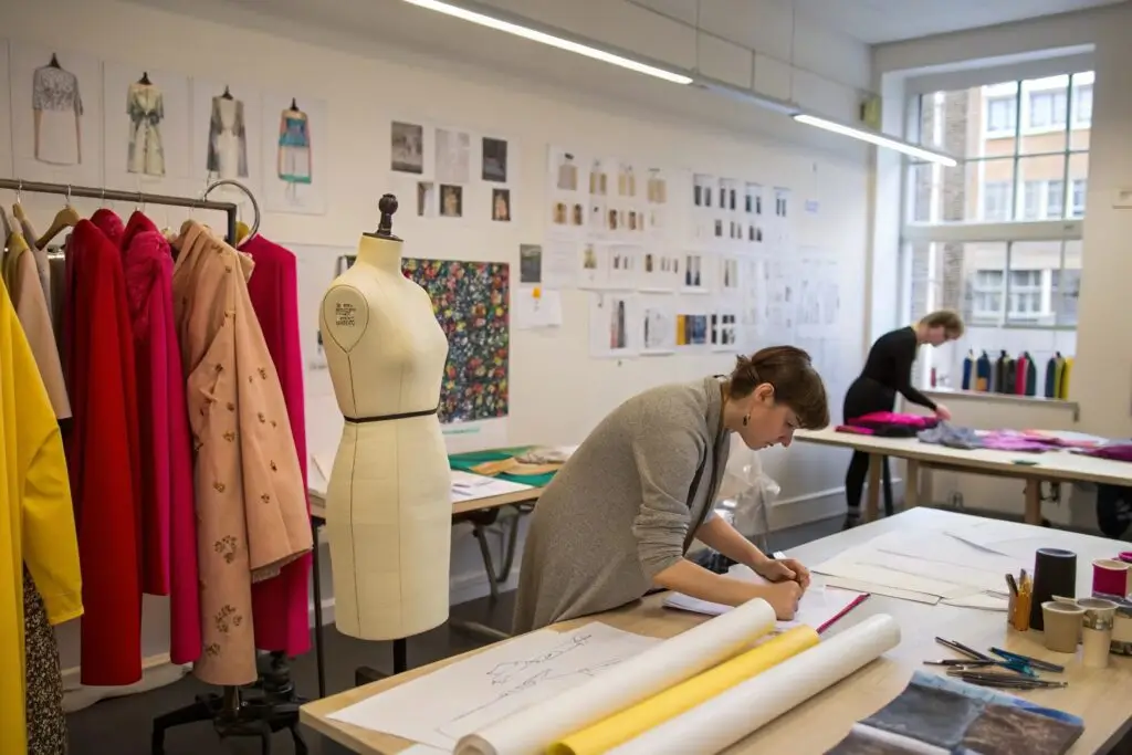 A fashion designer sketching new apparel ideas in a creative workspace