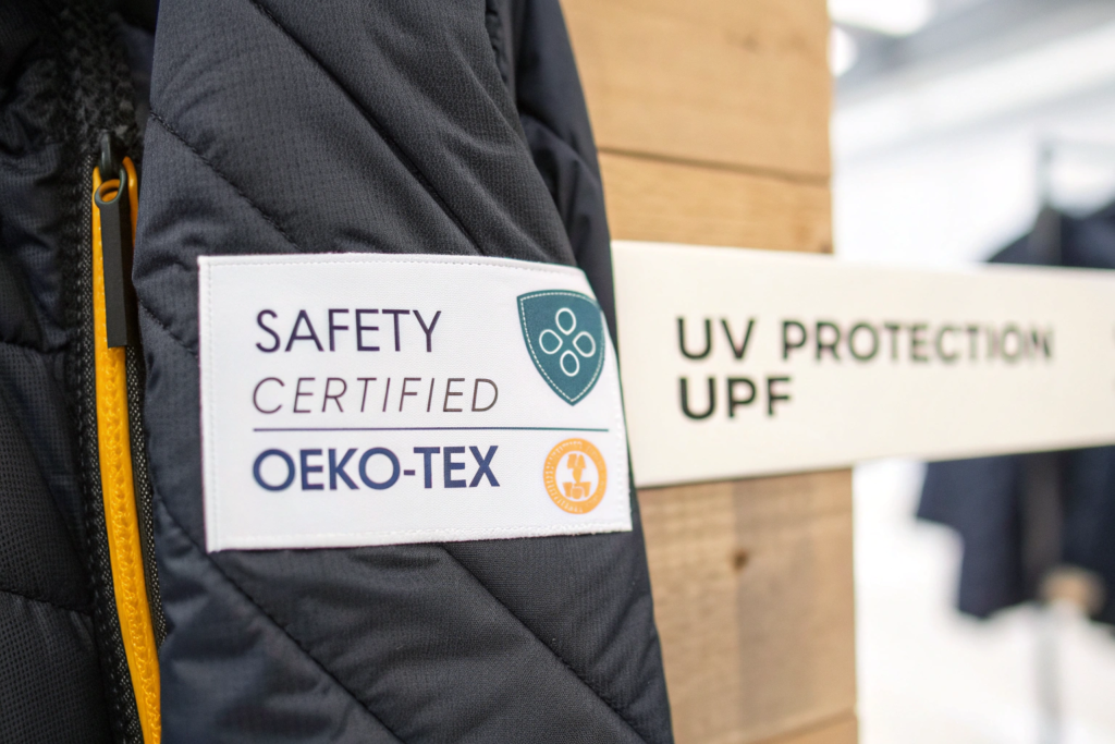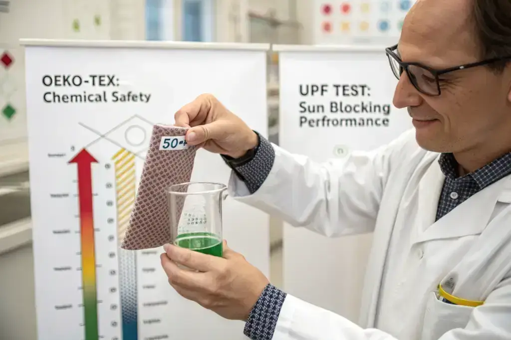 While OEKO-TEX covers safety, the functional claim of UV protection requires separate, performance-based testing. This is a two-claim product: one for safety (OEKO-TEX) and one for function (UPF rating).