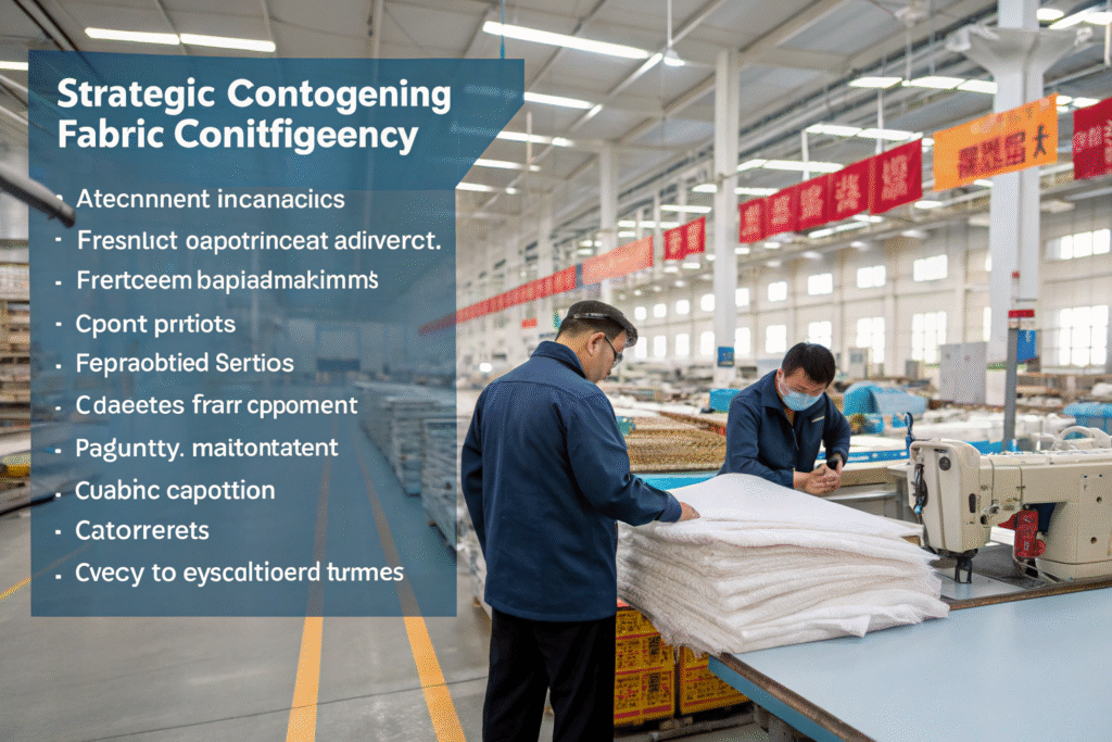 Strategic contingency planning addresses: alternative material sourcing options, cross-trained workforce deployment, equipment redundancy, and logistics alternatives. We maintain: relationships with backup suppliers for all critical materials, 15% cross-trained operators who can move between production lines, critical equipment spares on-site, and relationships with multiple logistics providers. When a specialty sewing machine failed during a tight deadline, our contingency plan had a replacement machine operational within 4 hours rather than the 3-5 day wait typical without such planning.