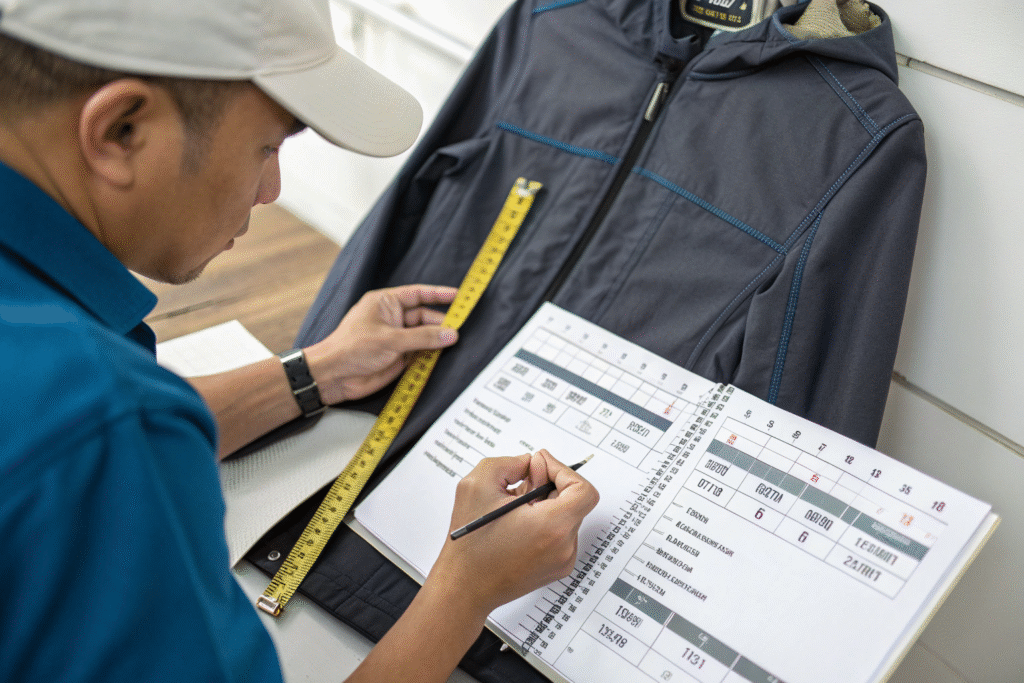 Detailed measurement charts with clear tolerances ensure that every garment, across all sizes, maintains consistent proportions and fit.