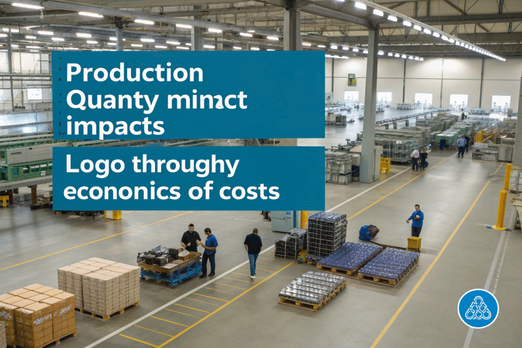 Production quantity significantly impacts logo costs through economies of scale, with setup costs distributed across units and production efficiency improving at higher volumes.