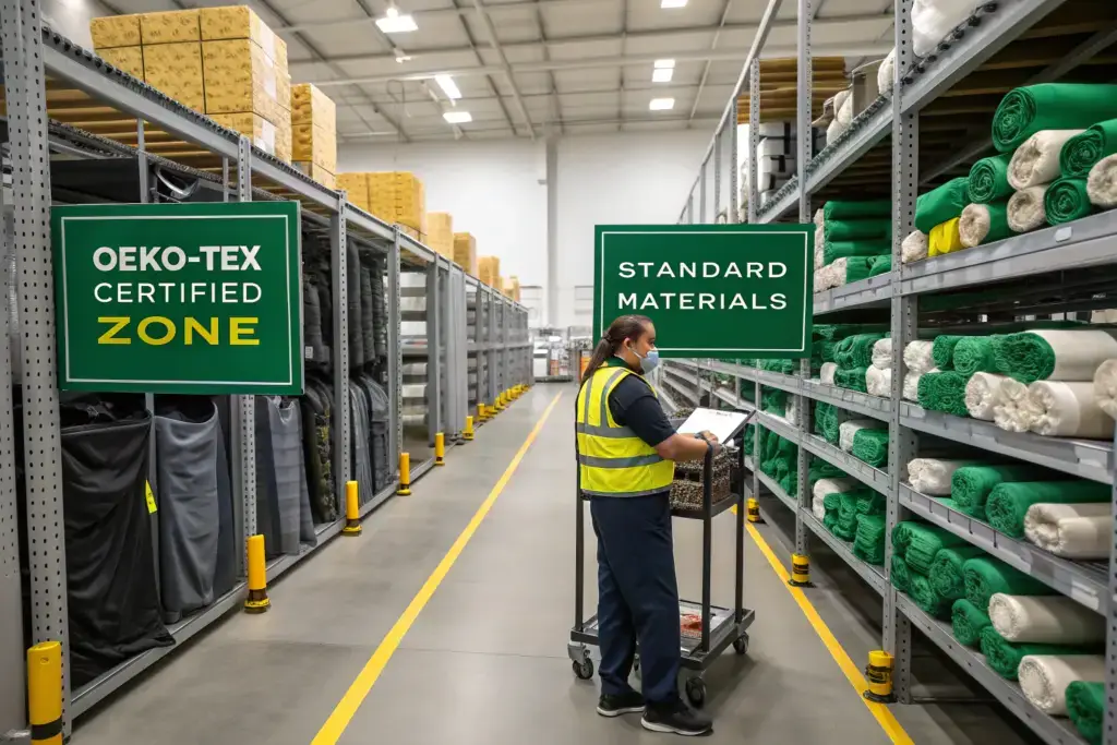 Our "Segregated Flow" system mandates that all OEKO-TEX certified raw materials—fabrics, threads, trims, and packaging—are received, stored, and issued in a physically separate warehouse zone with distinctive color-coded labeling, and are only allocated to pre-designated certified production lines, following a strict FIFO (First-In, First-Out) inventory protocol. Separation is built into our floor plan.