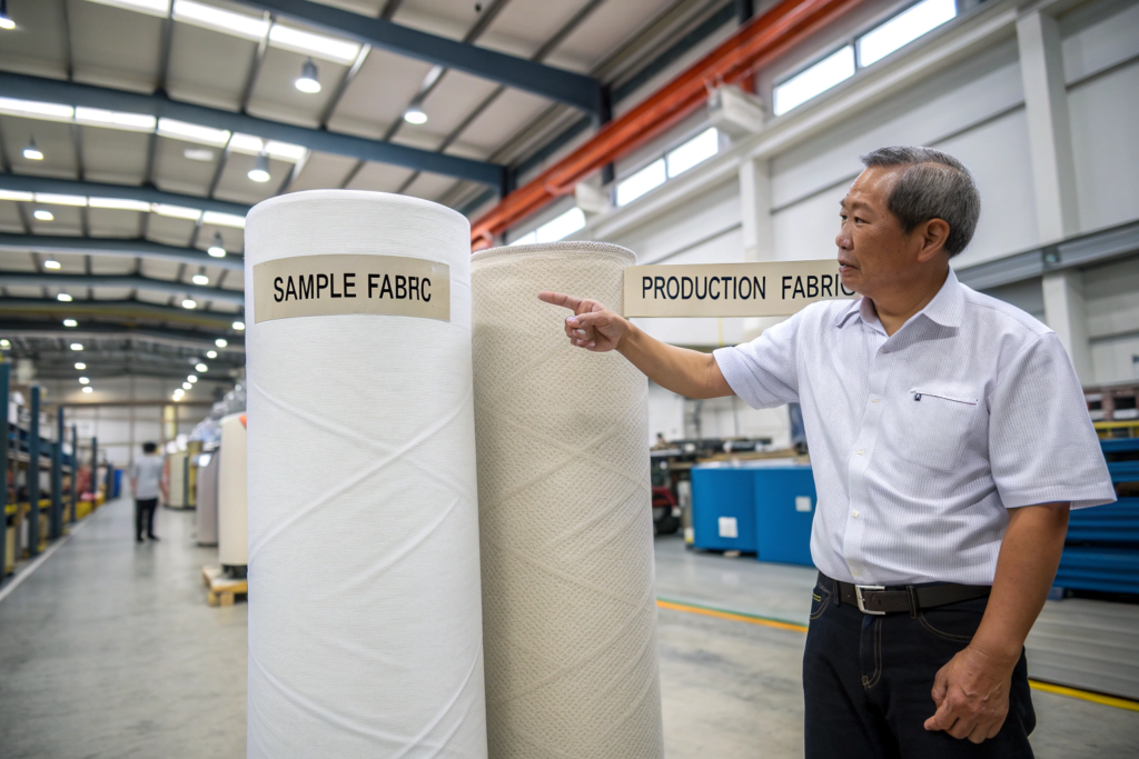 Samples can use different fabric. I remember a client from Chicago. They approved a sample made with sample fabric. The production fabric was different. The color was off. The weight was different. The fit changed.