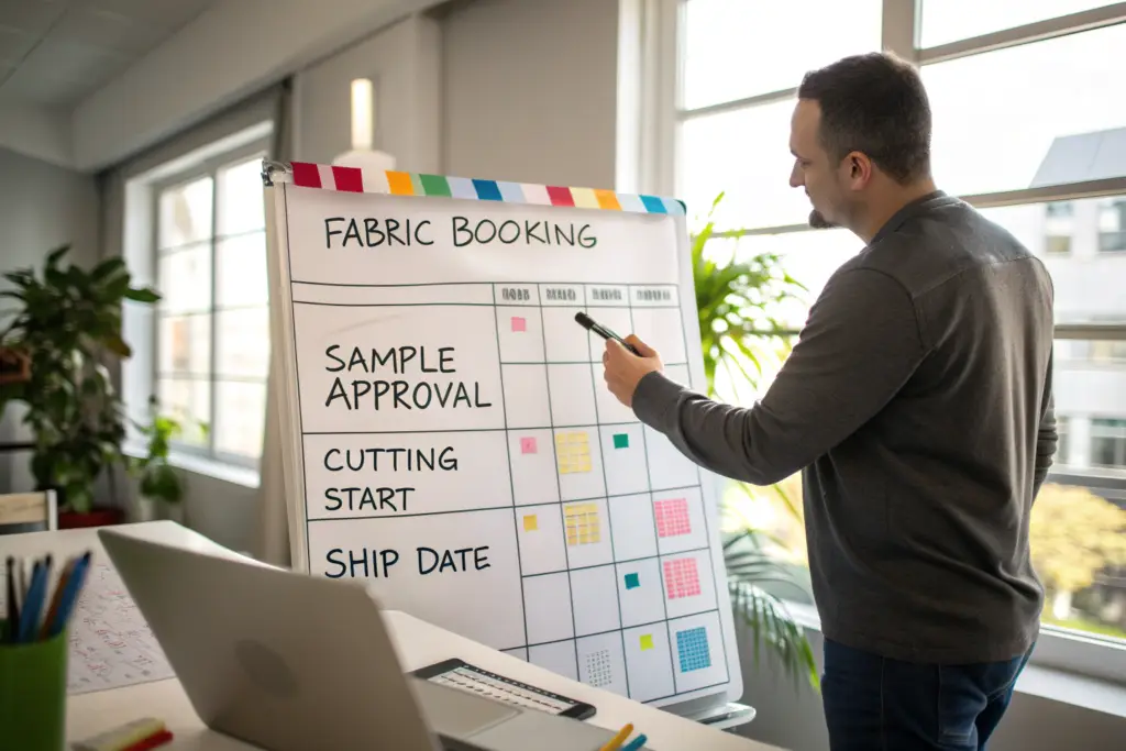 - Fabric booking to delivery: Add 2-3 weeks. Mills are often late.