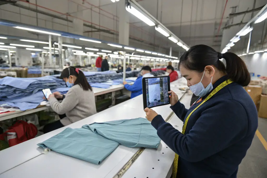 Fabric in. Cutting done. Sewing 50%. Pack. Chicago menswear tracked. Caught dye error week 3. Fixed fast. Ship on time. Use milestone checklist. Stay ahead.