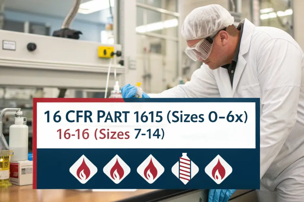 The two core regulations are 16 CFR Part 1615 (for children up to size 6X) and 16 CFR Part 1616 (for sizes 7–14). Both require the fabric and finished garment to self-extinguish within a few seconds under test conditions.