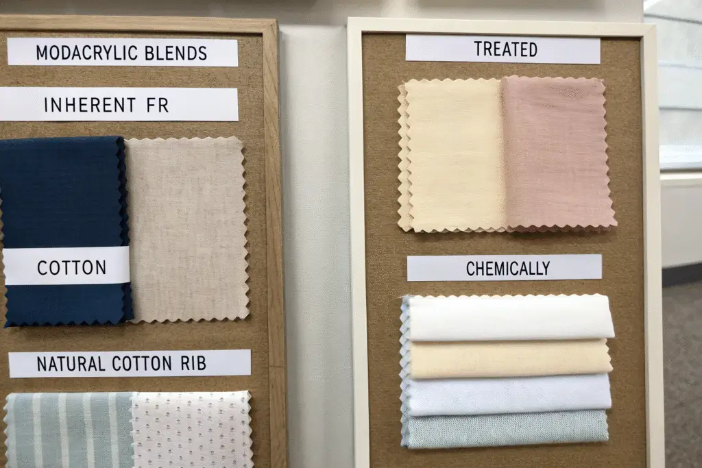 Common flame-compliant fabrics include modacrylic blends, inherently flame-resistant synthetics, and tightly knit cotton designed for snug-fit garments.