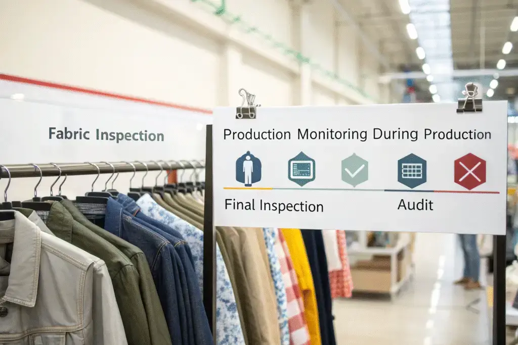In-process monitoring occurs during cutting, sewing, and assembly stages. Supervisors check pattern alignment, stitching quality, seam allowances, and component attachment while production is underway. This allows immediate correction before errors multiply. A denim brand discovered during in-process checks that their new sewing operators were using the wrong stitch density for bar tacks, which would have caused premature failure at stress points. The production monitoring caught this after only 50 units were affected rather than the full order of 2,000 pieces.
