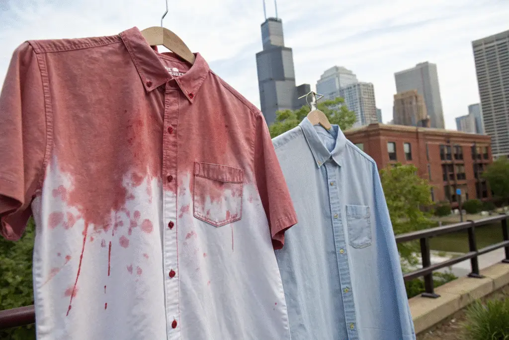 Color bleed. Chicago shirts buttons washed 30 times. No fade. Generic bled. Saved dye issue. Use wash fastness. Simulate use.