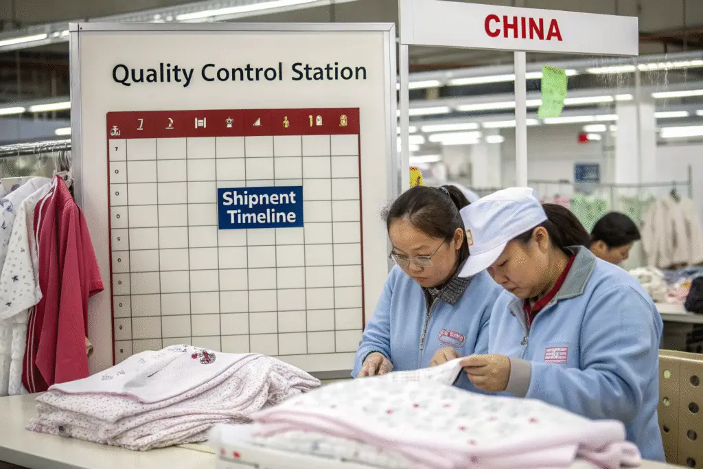 Recraft指令-- Depict a kidswear QC station with factory inspectors checking baby garments for seam alignment, label accuracy, and packaging. Include a calendar or schedule board showing shipment timeline. Faces must be natural, and no text overlay.
