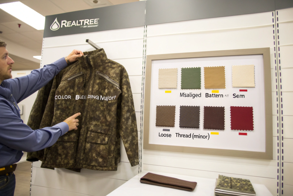 For Realtree, specific defects like "pattern misalignment greater than 1/4 inch at center front" or "color crocking (rubbing off) on printed logo" should be in the catalog. This eliminates subjective arguments over aesthetics.