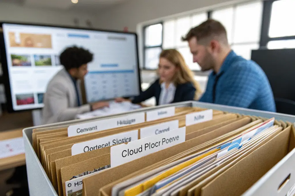 Clients access folders via Dropbox Business or Google Drive Shared Links. Some distributors prefer ZIP bundles, so we include both online preview and offline download.