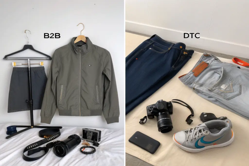 B2B buyers prefer flat lays, ghost mannequins, and hang tags; DTC brands need lifestyle shots, model photography, and detailed close-ups.