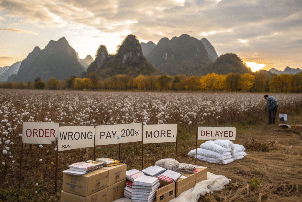 Cotton peaks in fall. Order wrong: pay 20% more. Ron learned hard. His winter coats delayed. Prices rose.