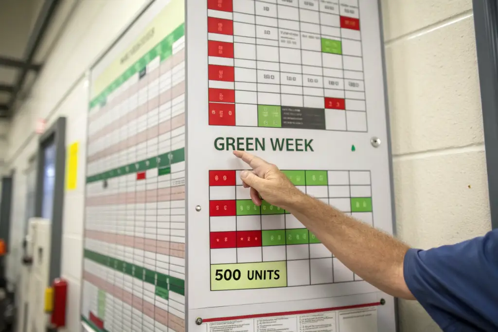 The factory manager checks the board. Line 3 is finishing a big order on the 15th. The next order for Line 3 does not start until the 22nd. That is a 7-day gap. That is 7 days of paying workers to stand around or clean machines.