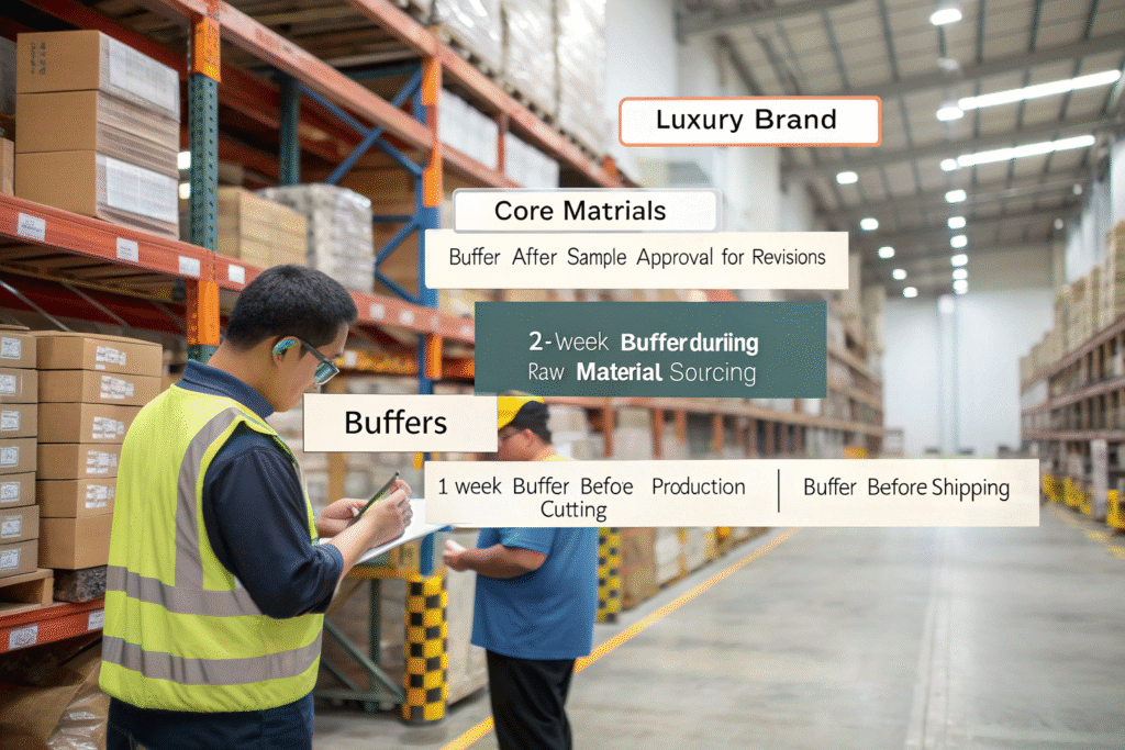 Effective buffering involves: time buffers at dependency points, capacity buffers with manufacturing partners, inventory buffers of core materials, and financial buffers for expedited solutions. Rather than adding blanket contingency time, successful brands place specific buffers: 1-week buffer after sample approval for any revisions, 2-week buffer during raw material sourcing, 1-week buffer before production cutting, and 1-week buffer before shipping. This targeted approach protected a luxury brand when their custom fabric was rejected - the 2-week material buffer allowed for replacement sourcing without impacting their delivery date.