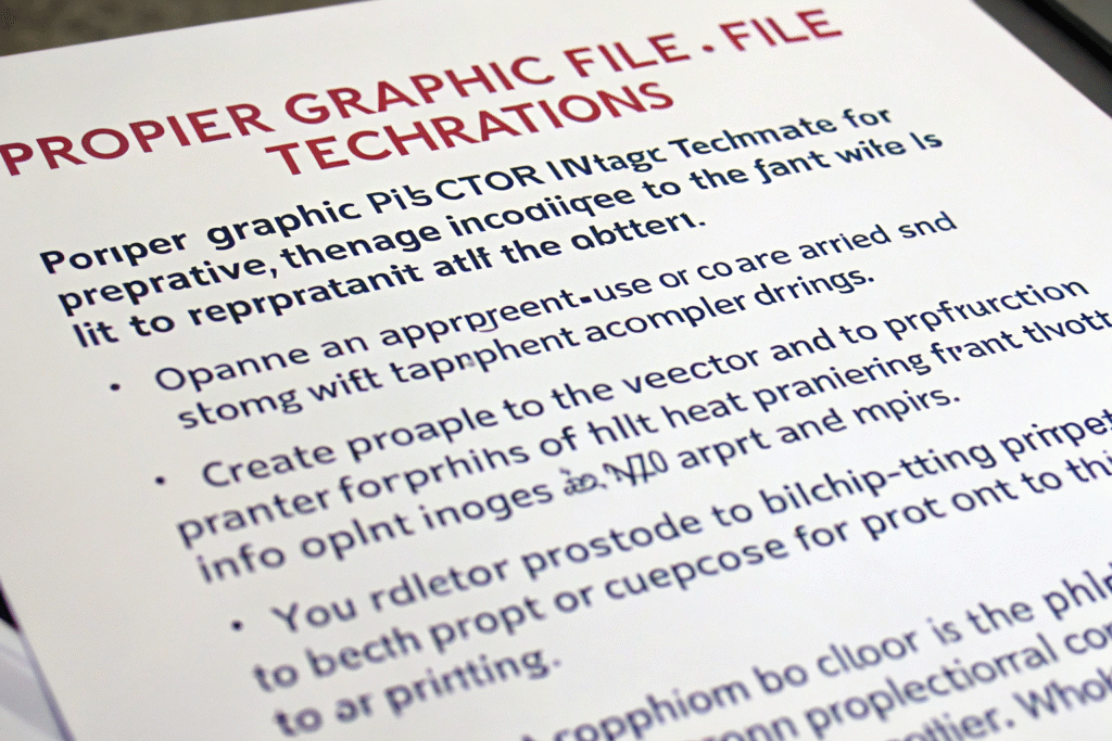 Proper graphic file preparation requires using vector formats when possible, ensuring adequate resolution for raster images, separating colors correctly, accounting for printing method limitations, and including clear placement specifications. The technical requirements vary significantly between screen printing, DTG, and heat transfer methods.