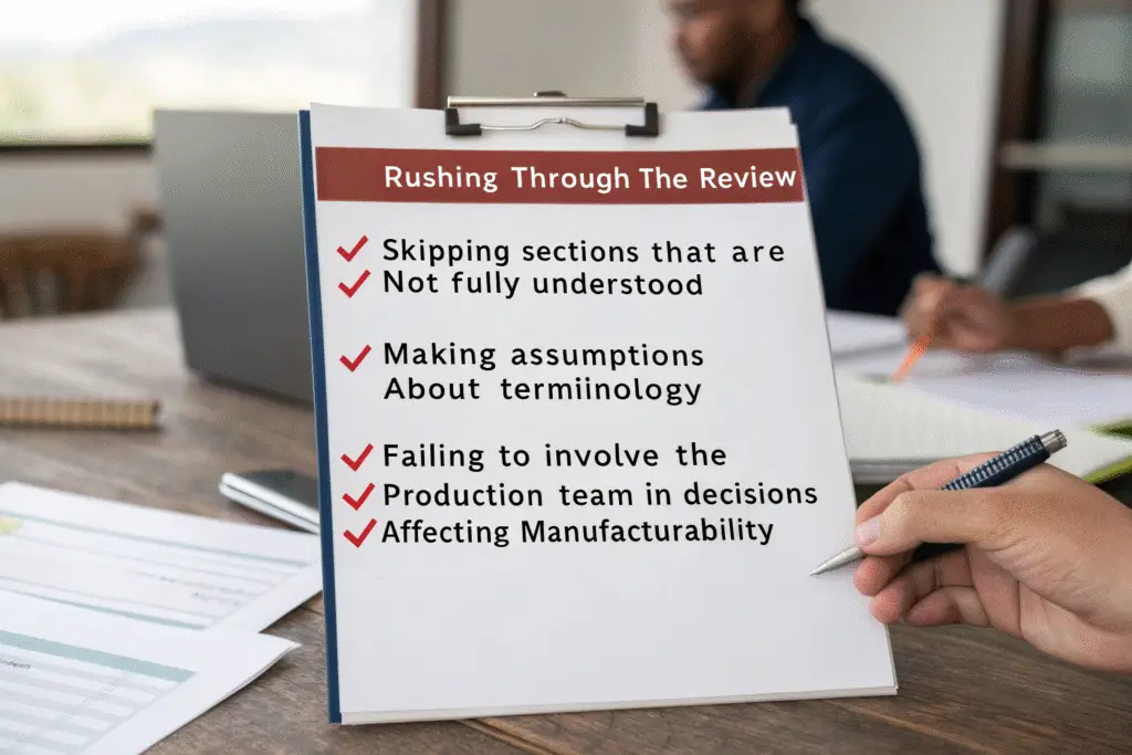Common mistakes to avoid include rushing through the review, skipping sections you don't fully understand, making assumptions about terminology, and not involving your production team in decisions that affect manufacturability. Each of these can lead to expensive corrections later.