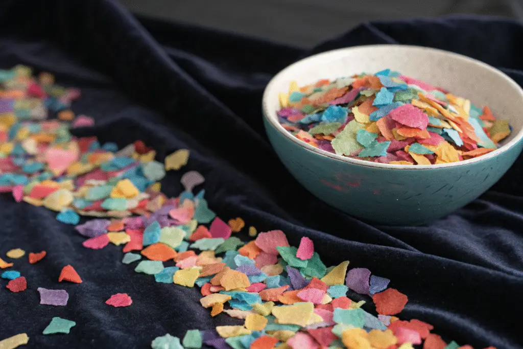 - Cornstarch film confetti: soft, feather-light—melts fast in moisture.