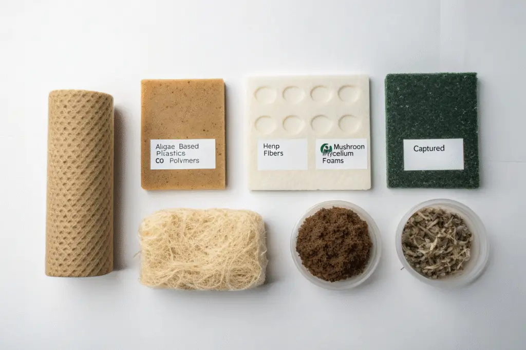 Carbon-negative materials include algae-based plastics, hemp fibers, mushroom mycelium foams, and captured-CO₂ polymers.