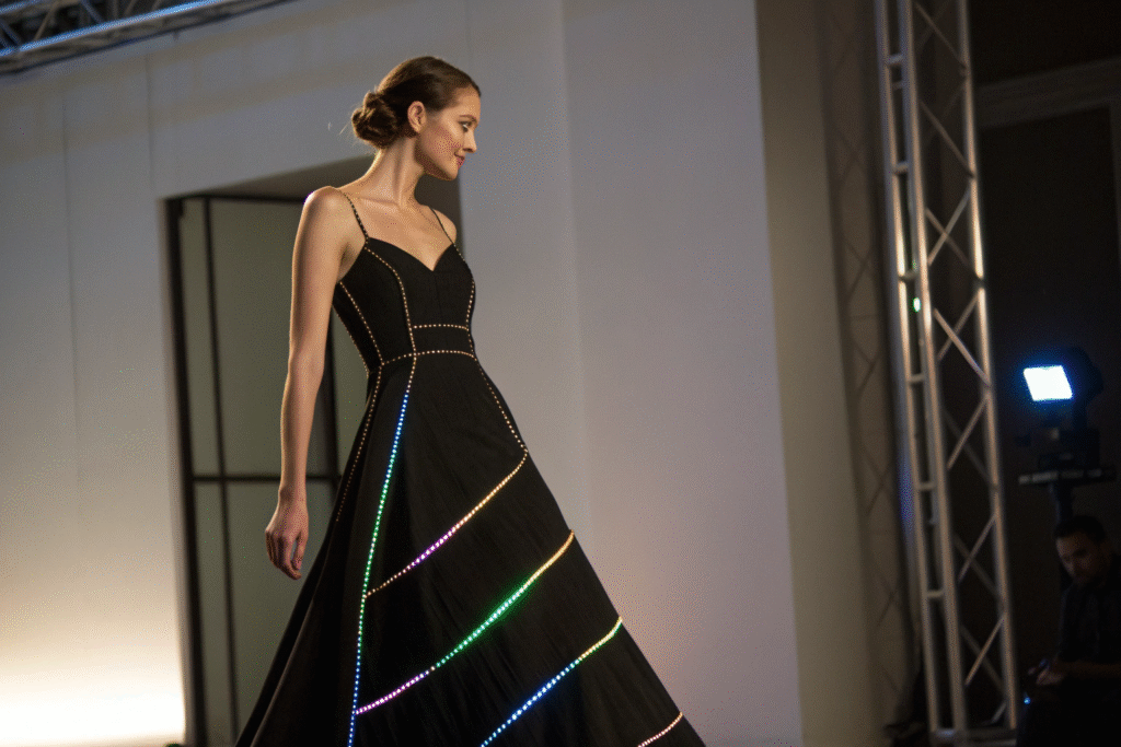 Actually, EL options come in several forms: wires, panels, or woven fibers, each changing the look of evening wear in different ways.