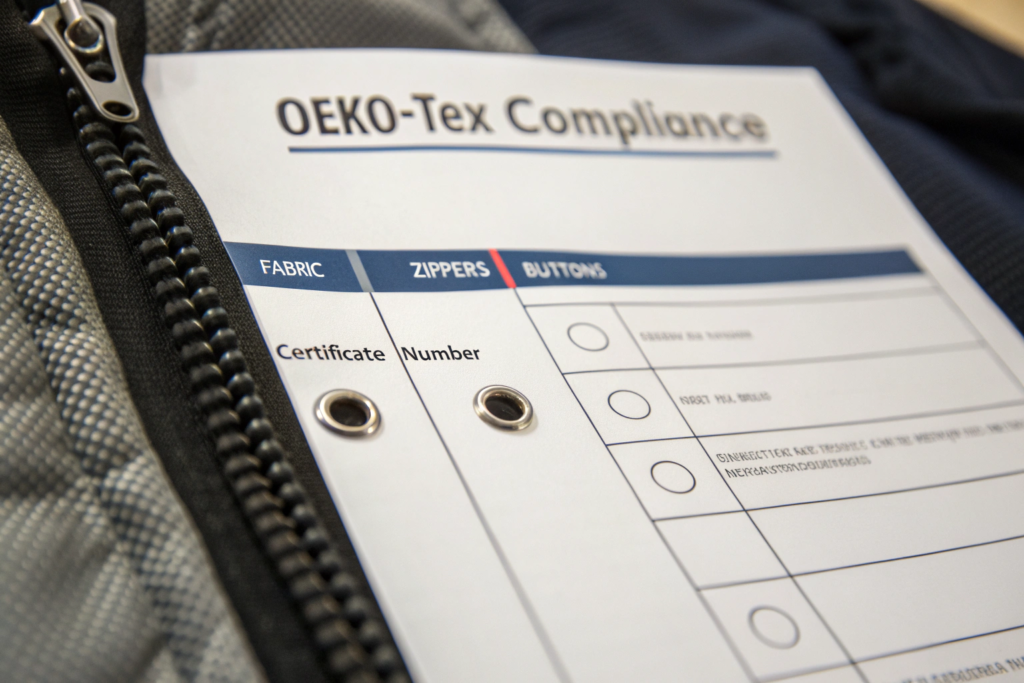 What if you need to change a button style mid-production? Any new component must be certified. Your factory should have a process to quickly source a certified alternative and provide its test report before it is used. This may cause a short delay, which is why finalizing all trims during development is crucial. We experienced a case where a client's chosen drawcord supplier failed a retest. Because we had pre-qualified backup suppliers with valid certificates, we switched sources within 48 hours with zero impact on the production schedule.