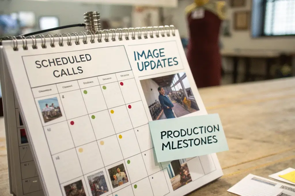 A predictable check-in schedule keeps production on track and reassures both sides.