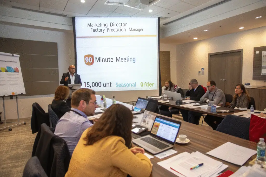 The fundamental objective is to establish a single, authoritative source of truth that all stakeholders can reference throughout the production lifecycle. This 90-minute meeting synchronizes every participant - from your marketing director to the factory's production manager - around precise objectives, iron-clad timelines, and unambiguous responsibilities for the 15,000-unit seasonal order. It transforms abstract concepts and mood boards into concrete, actionable plans with measurable milestones. For efficiency-focused business owners like Ron, who manages a $5M annual inventory budget, this meeting serves as the contractual handshake that locks in reliable production schedules and establishes rigorous quality benchmarks that protect his brand's hard-earned market reputation.