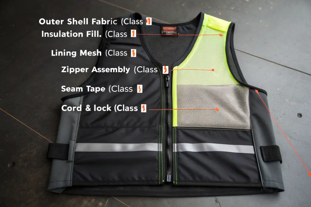A functional vest is a complex assembly of technical materials. Relying on a single certificate for the “garment” is insufficient and often misleading. True Grade 1 compliance requires a system where each material is individually certified to Class I standards.