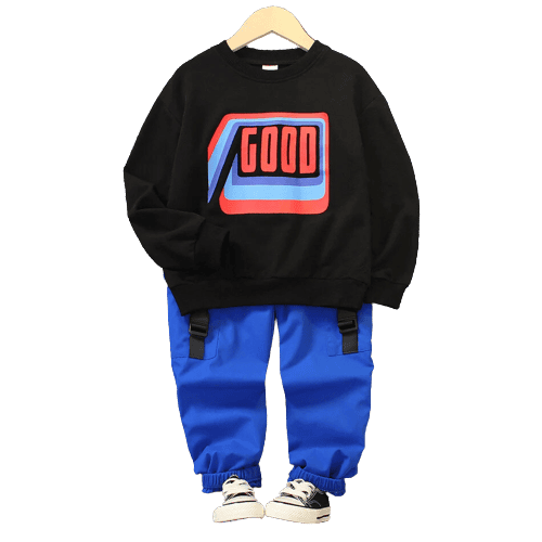 2pcs Kid Boy Letter Print Black Pullover Sweatshirt and Buckle Pocket Design Cargo Pants Set