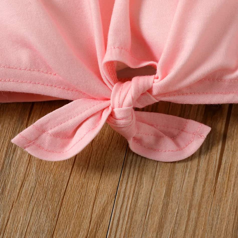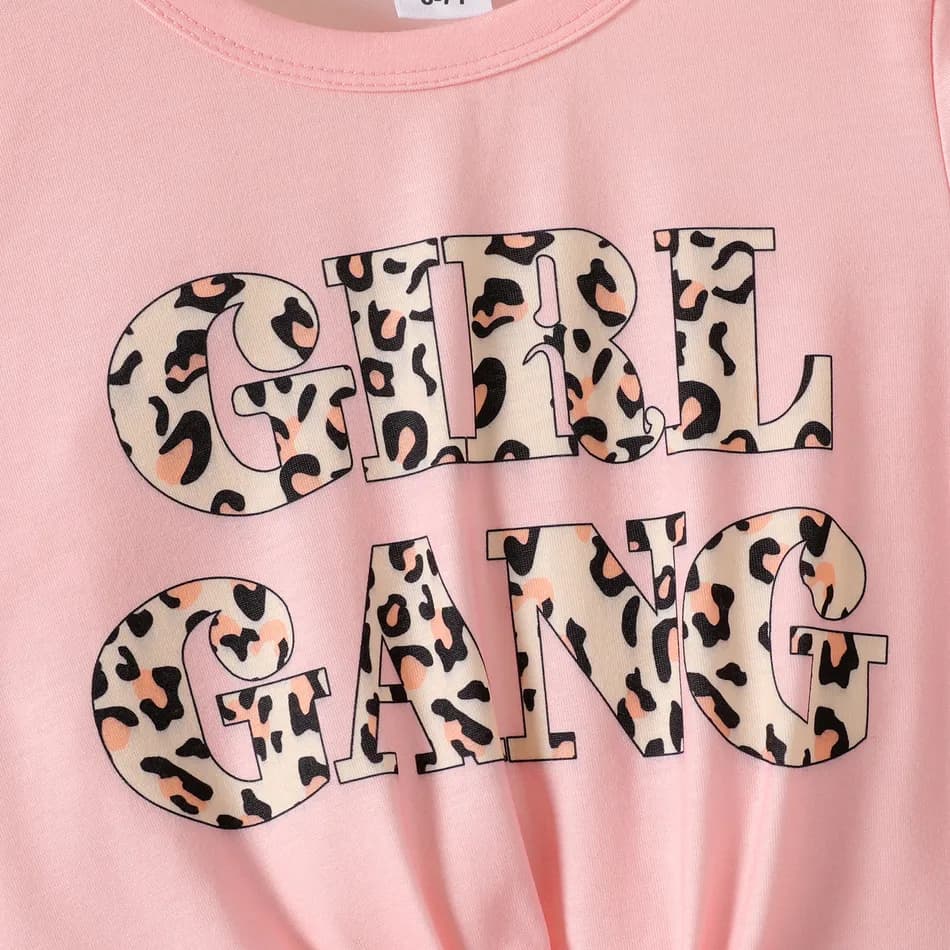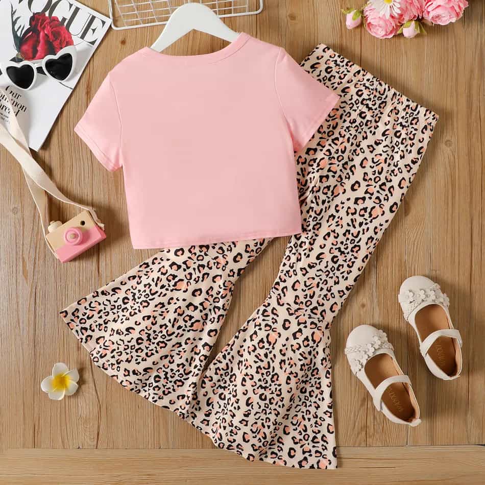 2pcs Kid Girl Letter Print Tie Knot Short-sleeve Pink Tee and Leopard Print Flared Pants Set