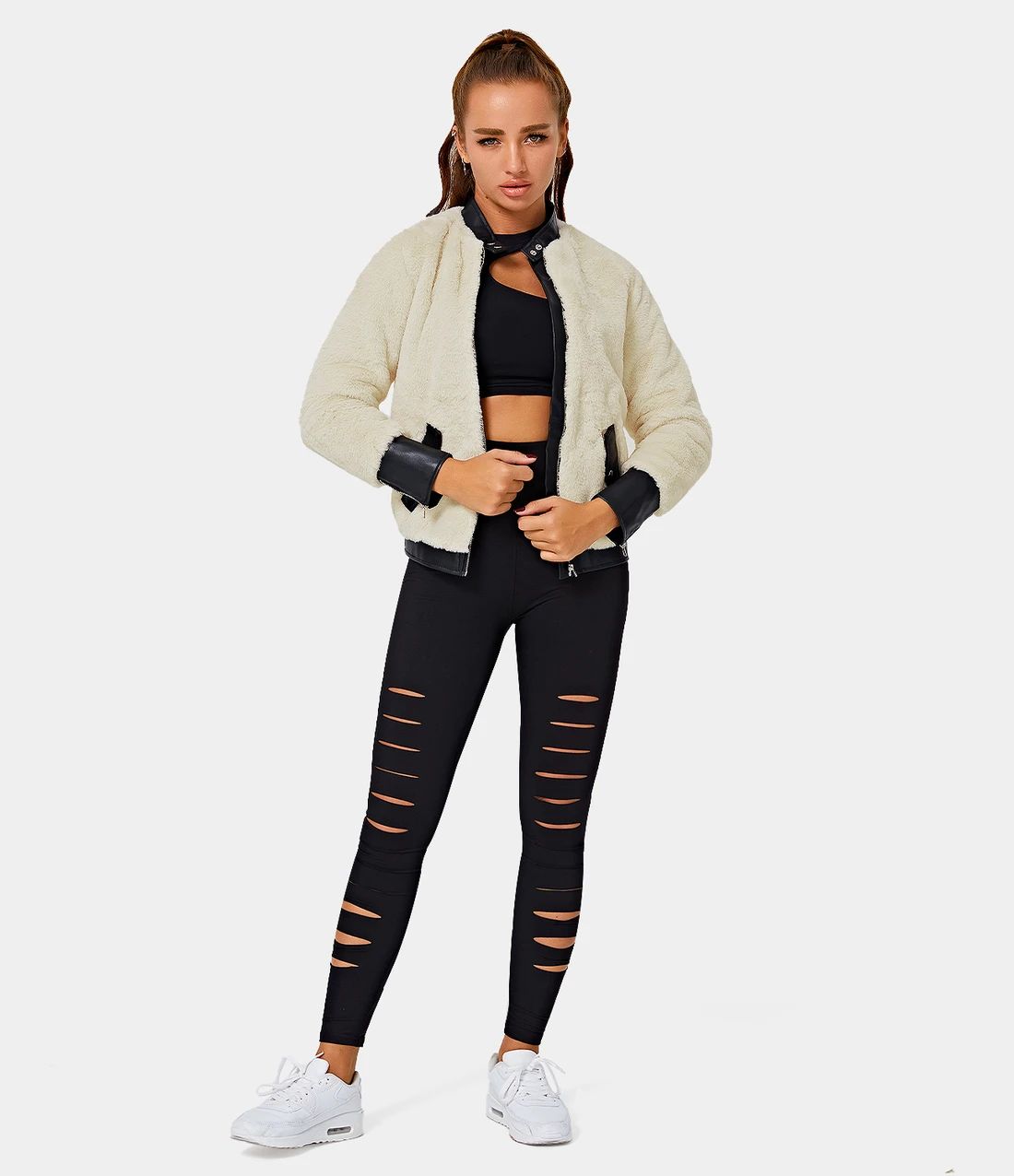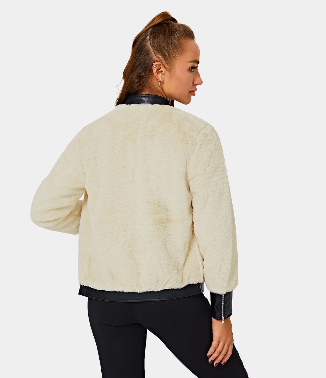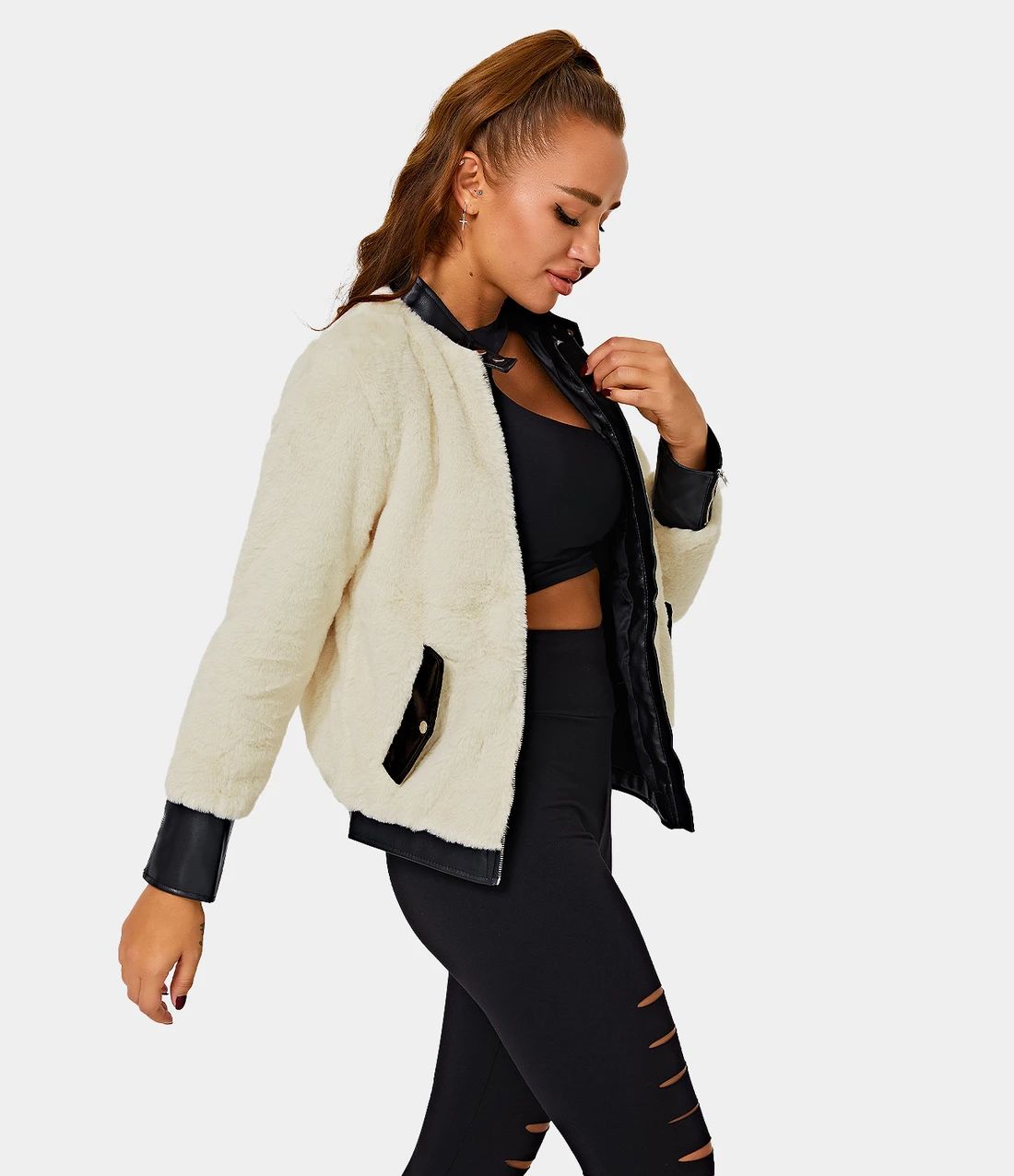 Funnel Neck Zipper Pocket Contrast Trim Teddy Jacket