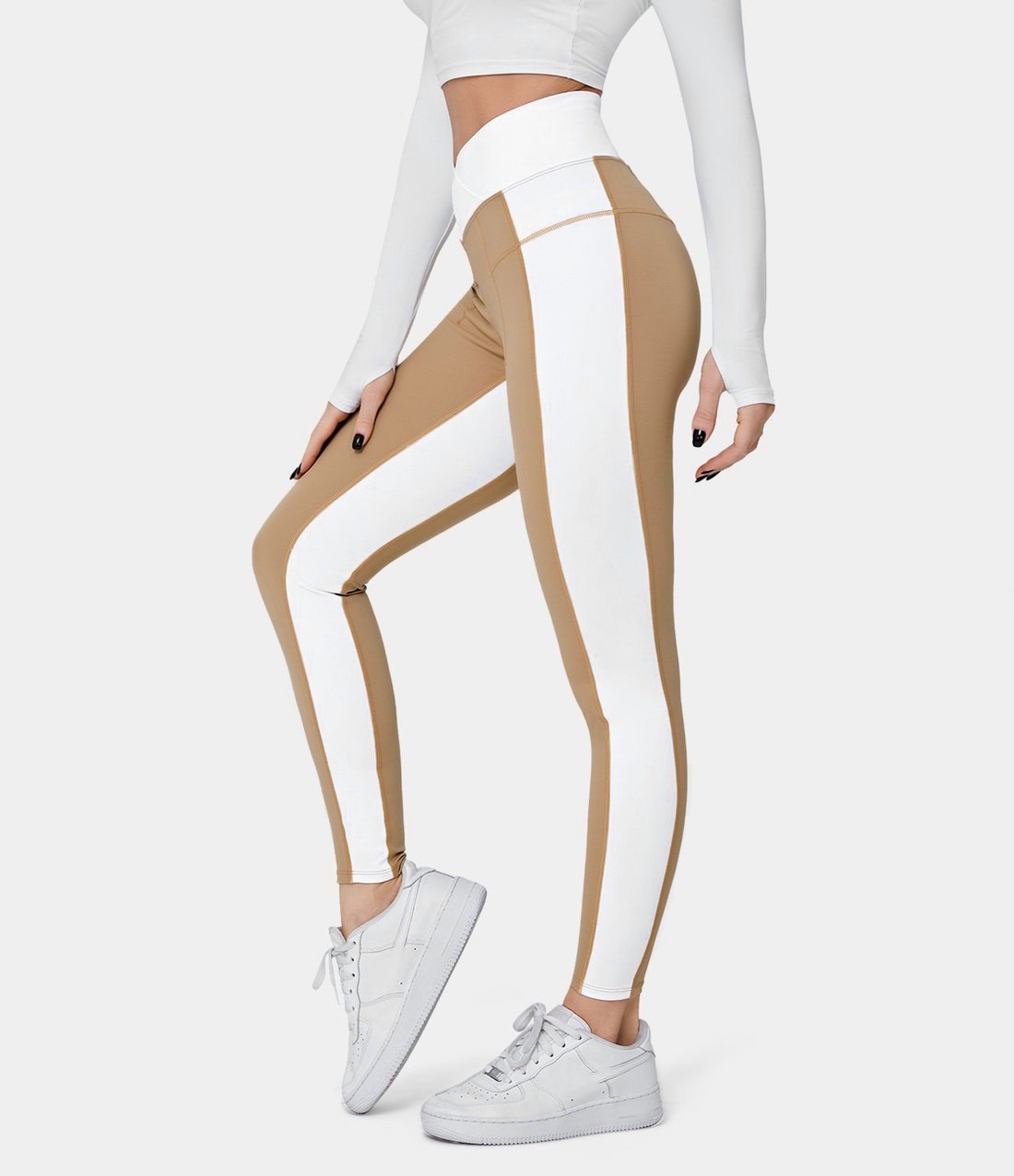 Mid Rise Crossover Color Block Back Waistband Pocket Leggings