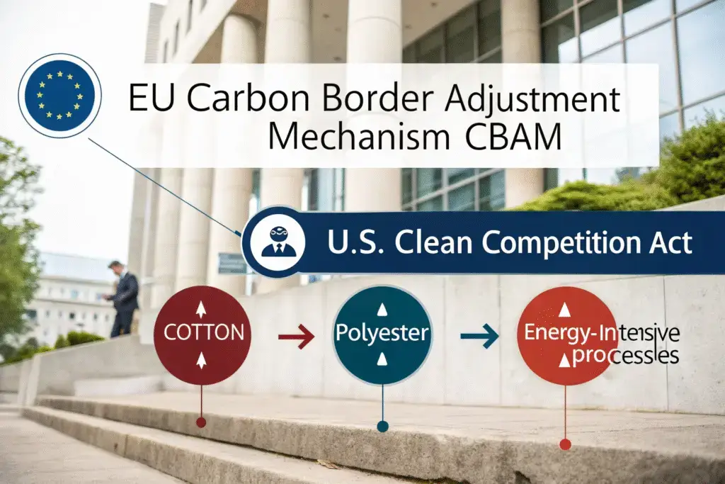 In the U.S., the proposed Clean Competition Act would apply carbon fees to imports based on their embodied emissions compared to domestic averages—likely affecting synthetic apparel, denim, and printed items by 2025–2026.