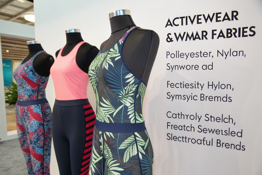 Polyester, nylon, and specially treated spandex blends are widely used in activewear and swimwear due to their strength, elasticity, and UV resistance. Many are designed to wick moisture, stretch comfortably, and retain shape even after sun exposure.