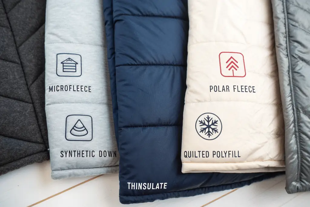 Common insulators include microfleece, polar fleece, synthetic down, quilted polyfill, and branded technologies like Thinsulate or PrimaLoft.