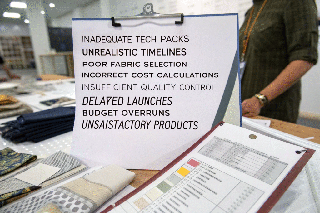 The most common mistakes in first-time clothing production include inadequate tech packs, unrealistic timelines, poor fabric selection, incorrect cost calculations, and insufficient quality control. These errors often stem from inexperience and can lead to delayed launches, budget overruns, and unsatisfactory products.