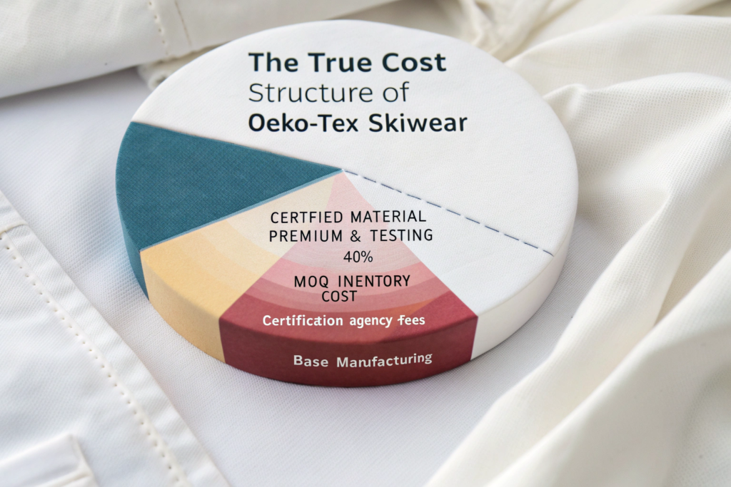 Let's break down a typical scenario for a new ski jacket style. Material pre-testing before bulk order can cost $500-$1,500 per type. The formal finished product certification can range from $2,000 to $5,000. OEKO-TEX certified fabrics carry a 10-30% price premium. A mill may require 3,000 meters of certified fabric versus 1,000 meters for non-certified. For a brand developing 5 styles, upfront costs can easily exceed $20,000 before a single garment is sewn.