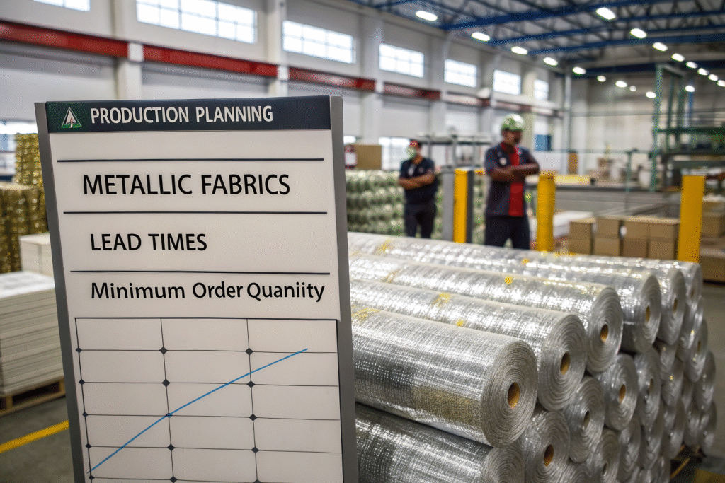 Specialty fabrics aren’t always stocked. Metallic textiles are often made to order, especially when you require custom foil color, jacquard design, or lamination combinations.
