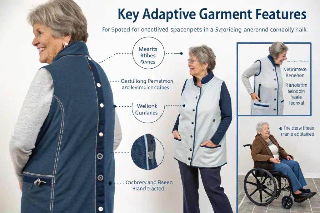 The top adaptive garment features include magnetic or velcro fastenings, elastic waistbands, open-back closures, flat seams, seated-friendly cuts, and tagless labels.