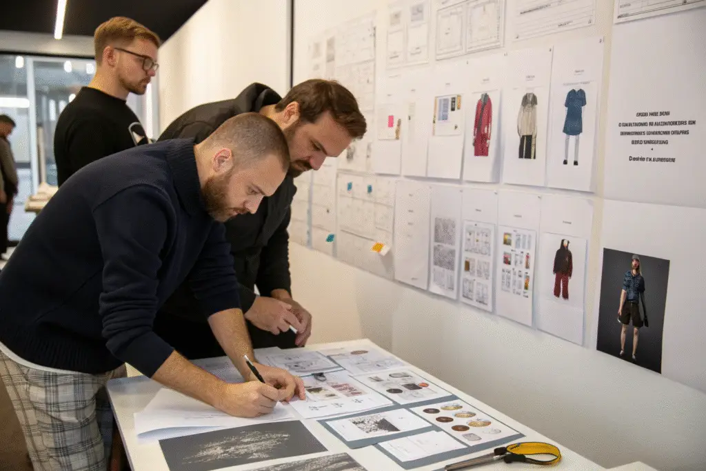 Material and trim sourcing happens alongside design development. This includes fabric selection, finding matching threads, zippers, buttons, and other components. We maintain a sourcing database of reliable suppliers to streamline this process while ensuring quality and compliance.