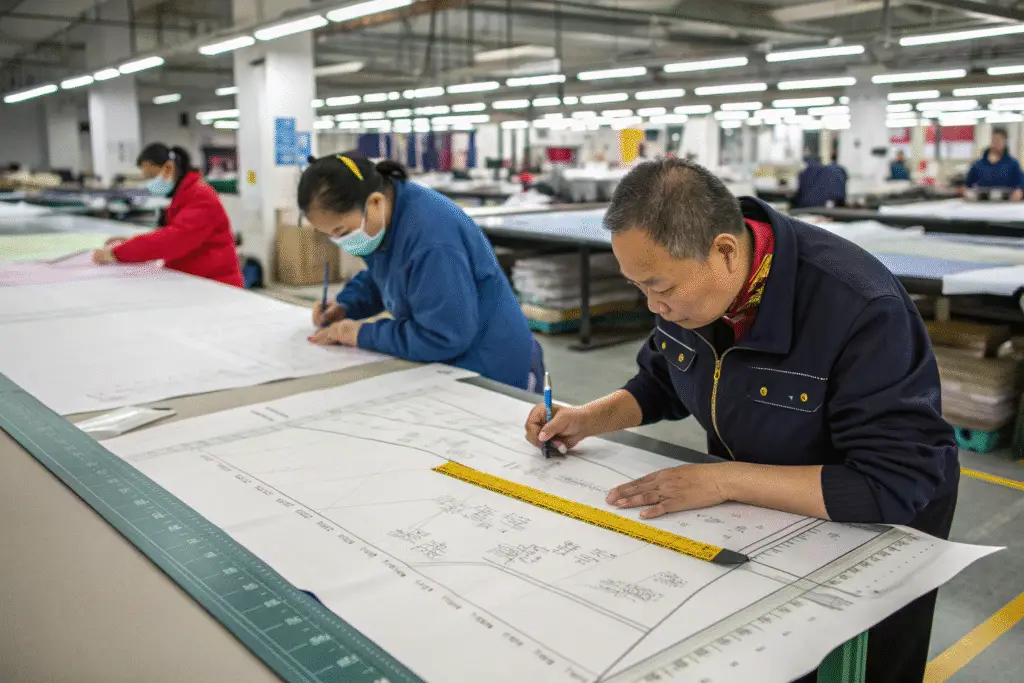 Marker making arranges pattern pieces on fabric to minimize waste. Efficient marker making can reduce fabric consumption by 10-15%. We use CAD marker optimization software to achieve industry-leading fabric utilization rates of 85-92% depending on fabric width and design complexity.