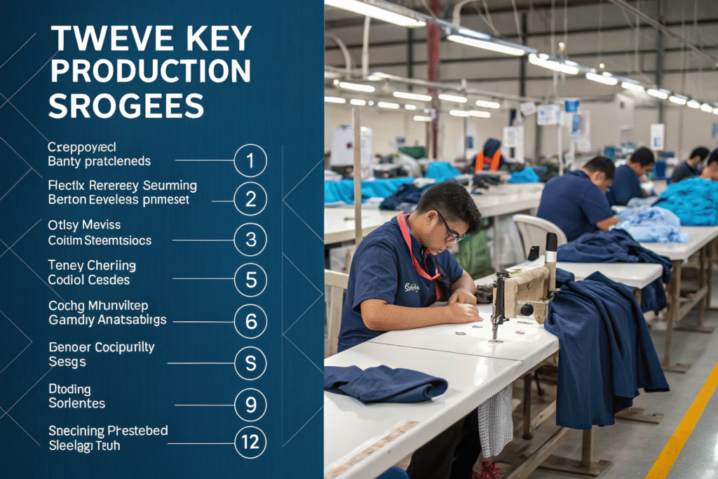 The apparel production process involves twelve key stages: design conceptualization, tech pack creation, sourcing, sampling, pattern making, grading, marker making, cutting, sewing, finishing, quality control, and shipping. Each stage builds upon the previous one, requiring careful coordination and expertise to ensure quality and timeliness.
