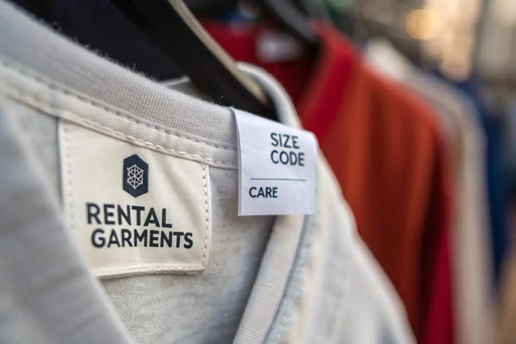 Rental garments need branding elements that stay put, remain legible, and allow for relabeling or resale later.