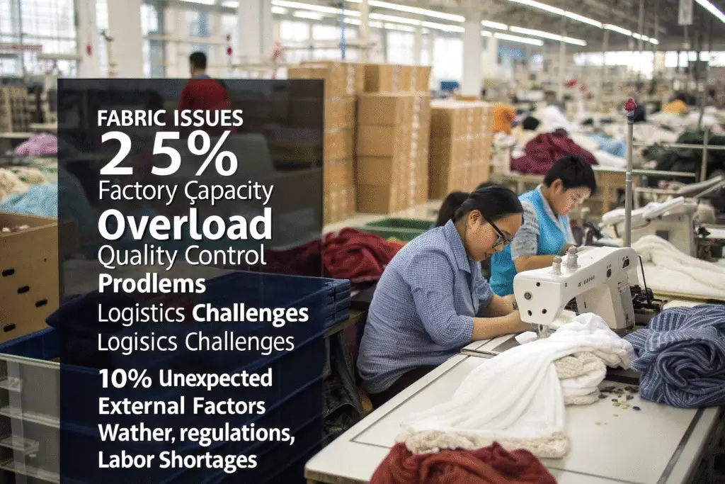 Fabric problems represent the most common and often most severe source of production delays. Material issues can halt production lines completely, affecting multiple clients simultaneously.